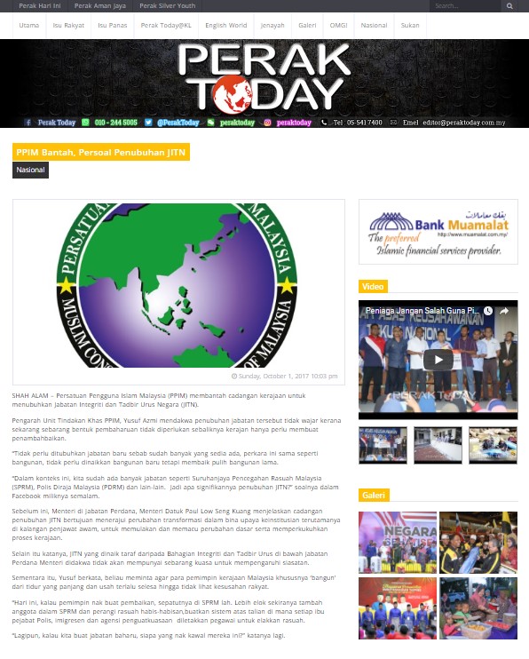 SHAH ALAM – Persatuan Pengguna Islam Malaysia (PPIM) membantah cadangan kerajaan untuk menubuhkan Jabatan Integriti dan Tadbir Urus Negara (JITN).