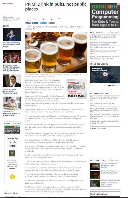 In agreeing with the move by City Hall to reject the application by the organisers of Better Beer Festival 2017 scheduled for next month, Nadzim said such large-scale events which occupied public space were inappropriate.