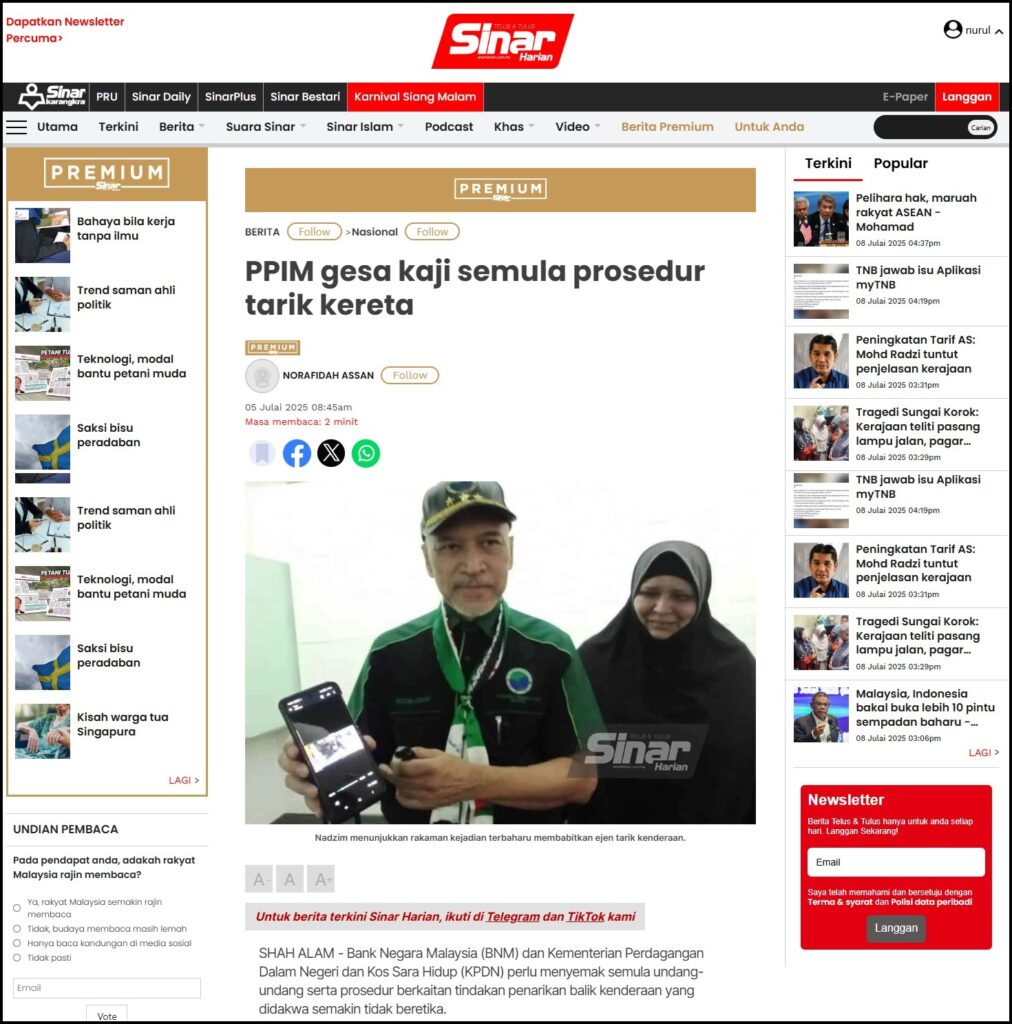 Ketua Aktivis Persatuan Pengguna Islam Malaysia (PPIM), Datuk Nadzim Johan berkata, ini susulan terdapat segelintir ejen tarik kenderaan bertindak keterlaluan sehingga menceroboh kawasan kediaman berpagar tanpa kebenaran sah, sambil mendakwa mempunyai writ mahkamah untuk menarik kereta.