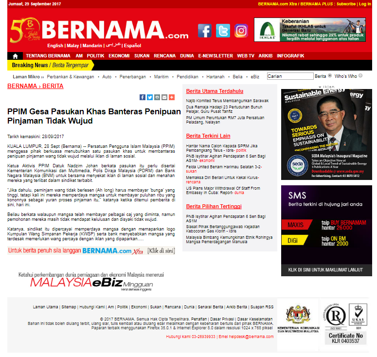 Ketua Aktivis PPIM Datuk Nadzim Johan berkata pasukan itu perlu disertai Kementerian Komunikasi dan Multimedia, Polis Diraja Malaysia (PDRM) dan Bank Negara Malaysia (BNM) untuk bersama menyekat iklan di laman sosial dan menahan mereka yang terlibat dalam sindiket terbabit.