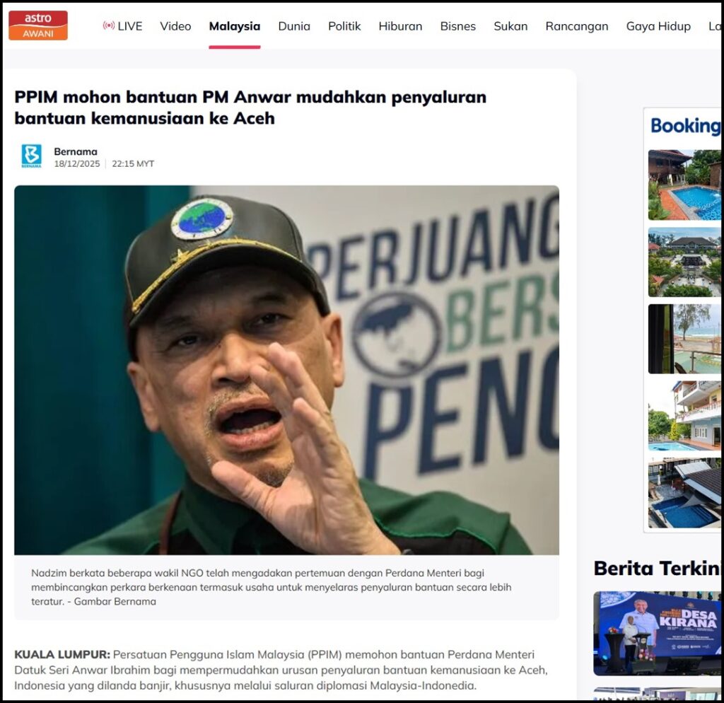 PPIM MOHON BANTUAN PM ANWAR MUDAHKAN PENYALURAN BANTUAN KEMANUSIAAN KE ACEH – ASTRO AWANI – 18/12/2025