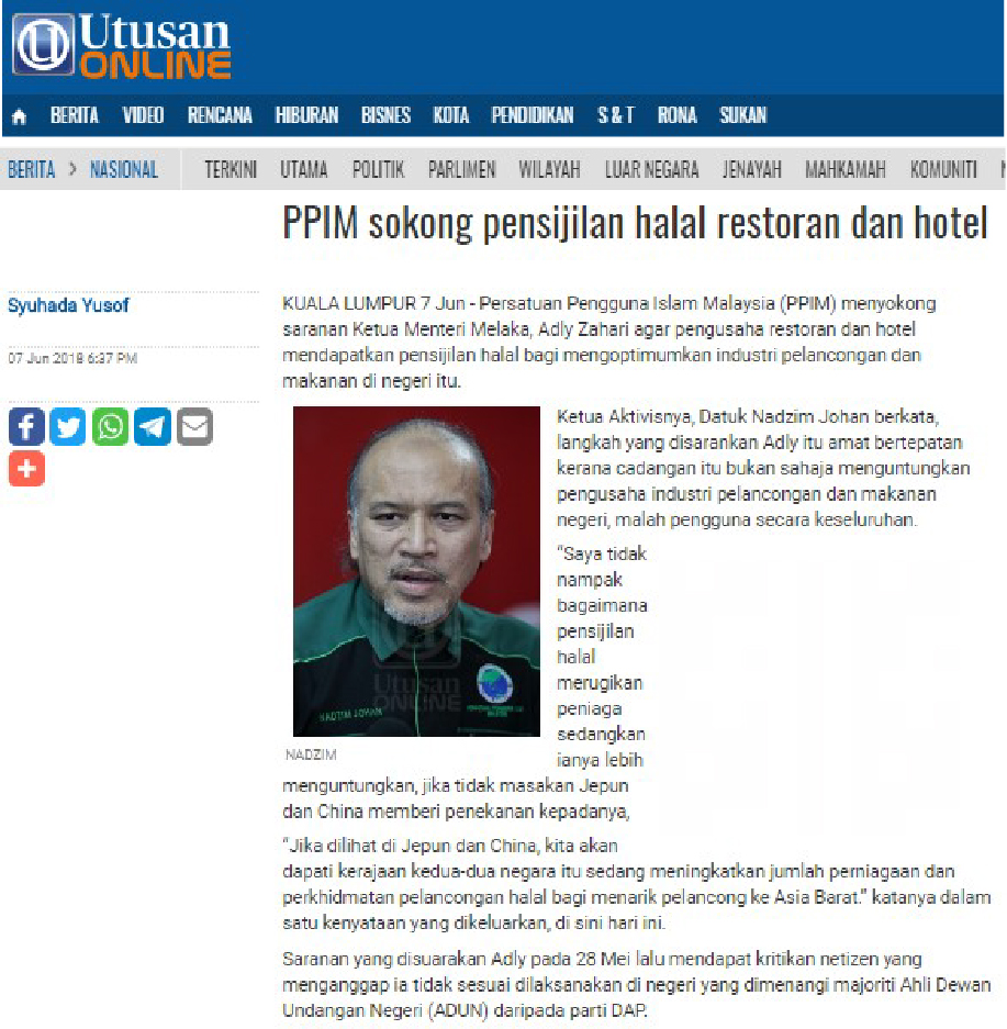 KUALA LUMPUR 7 Jun – Persatuan Pengguna Islam Malaysia (PPIM) menyokong saranan Ketua Menteri Melaka, Adly Zahari agar pengusaha restoran dan hotel mendapatkan pensijilan halal bagi mengoptimumkan industri pelancongan dan makanan di negeri itu.