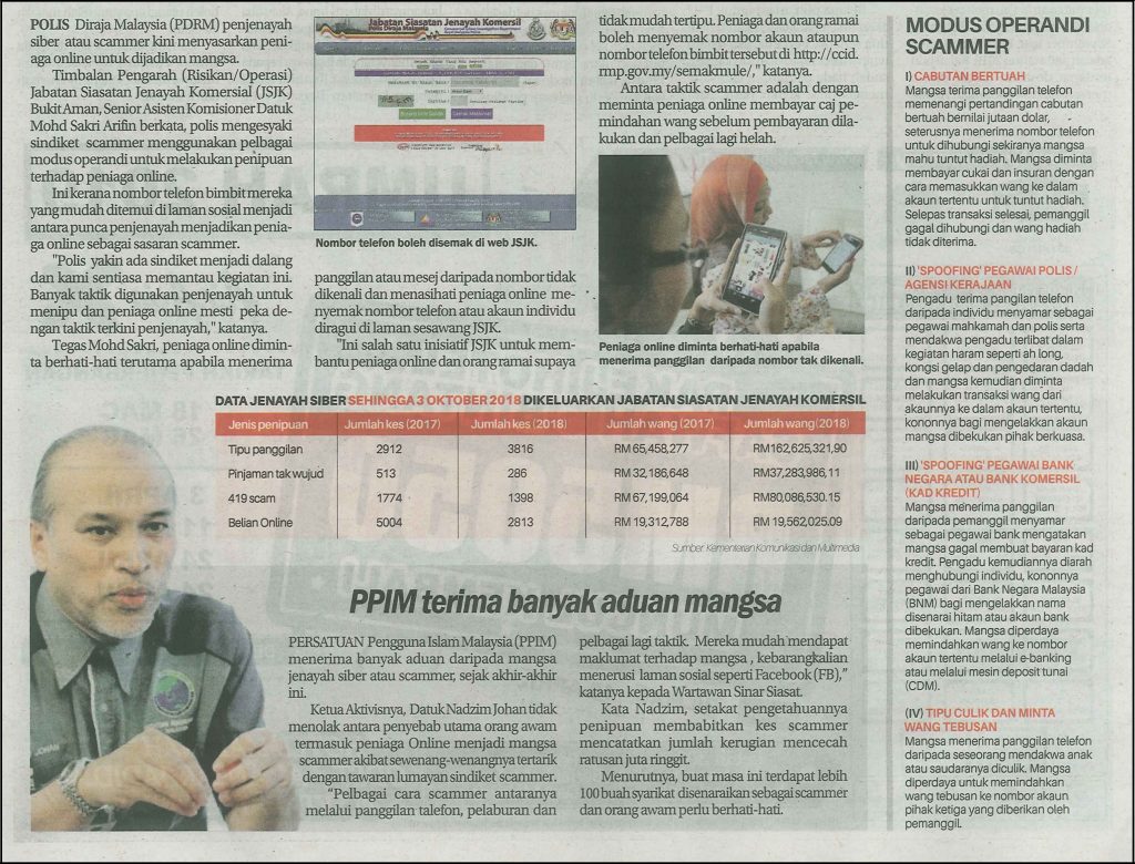 PERSATUAN Pengguna Islam Malaysia (PPIM) menerima banyak aduan daripada mangsa jenayah siber atau scammer, sejak akhir-akhir ini.