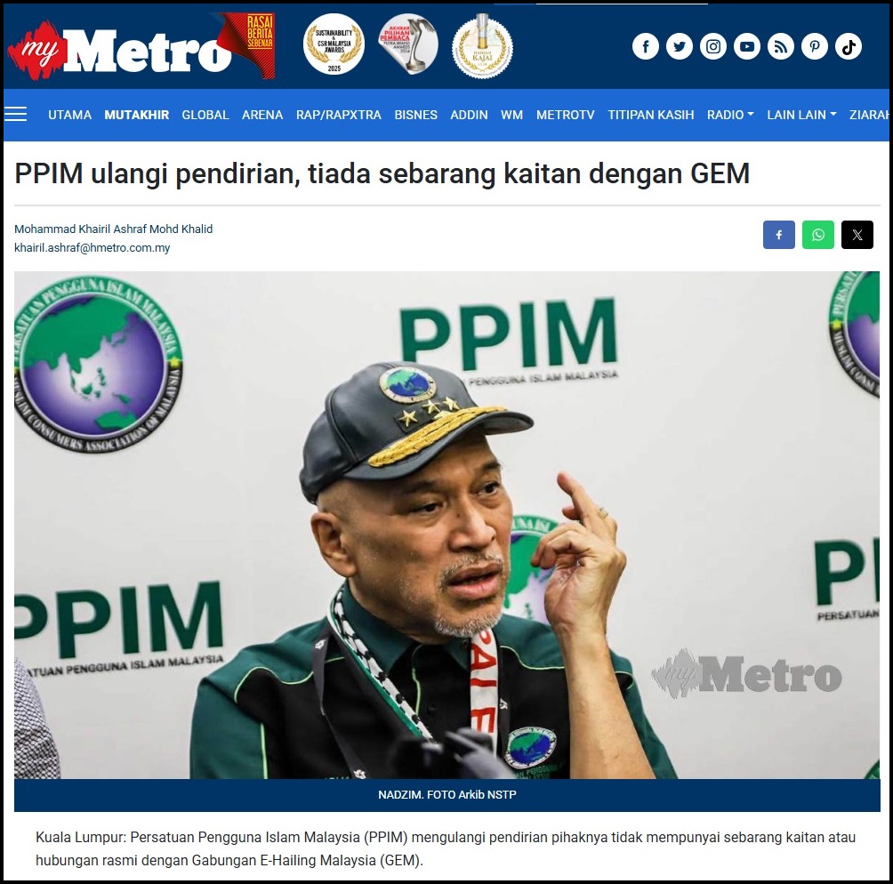 Kuala Lumpur: Persatuan Pengguna Islam Malaysia (PPIM) mengulangi pendirian pihaknya tidak mempunyai sebarang kaitan atau hubungan rasmi dengan Gabungan E-Hailing Malaysia (GEM).