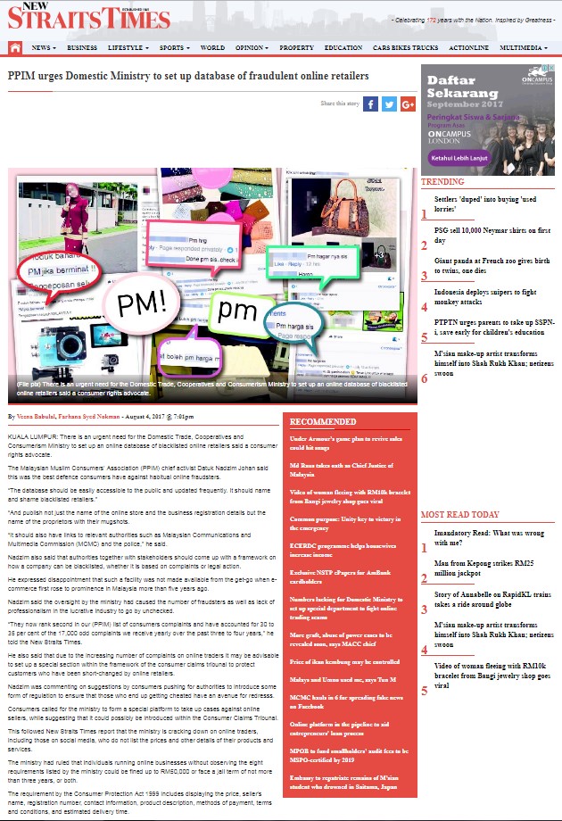 KUALA LUMPUR: There is an urgent need for the Domestic Trade, Cooperatives and Consumerism Ministry to set up an online database of blacklisted online retailers said a consumer rights advocate.