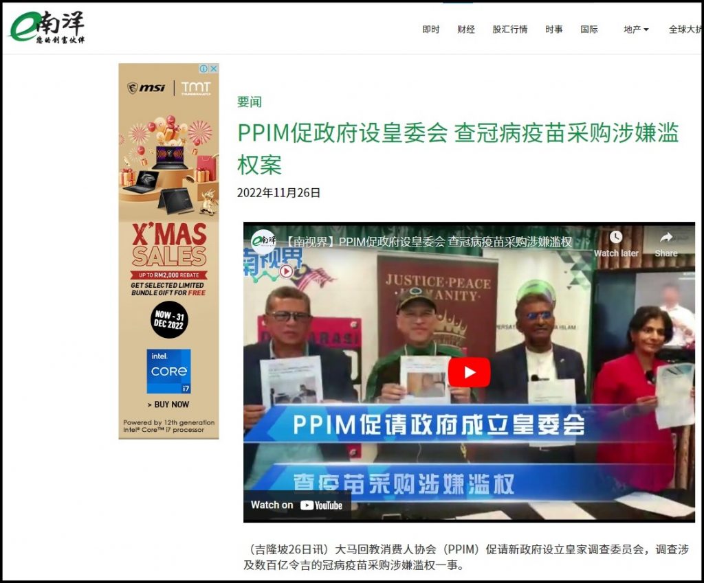 (吉隆坡26日讯)大马回教消费人协会(PPIM)促请新政府设立皇家调查委员会,调查涉及数百亿令吉的冠病疫苗采购涉嫌滥权一事。