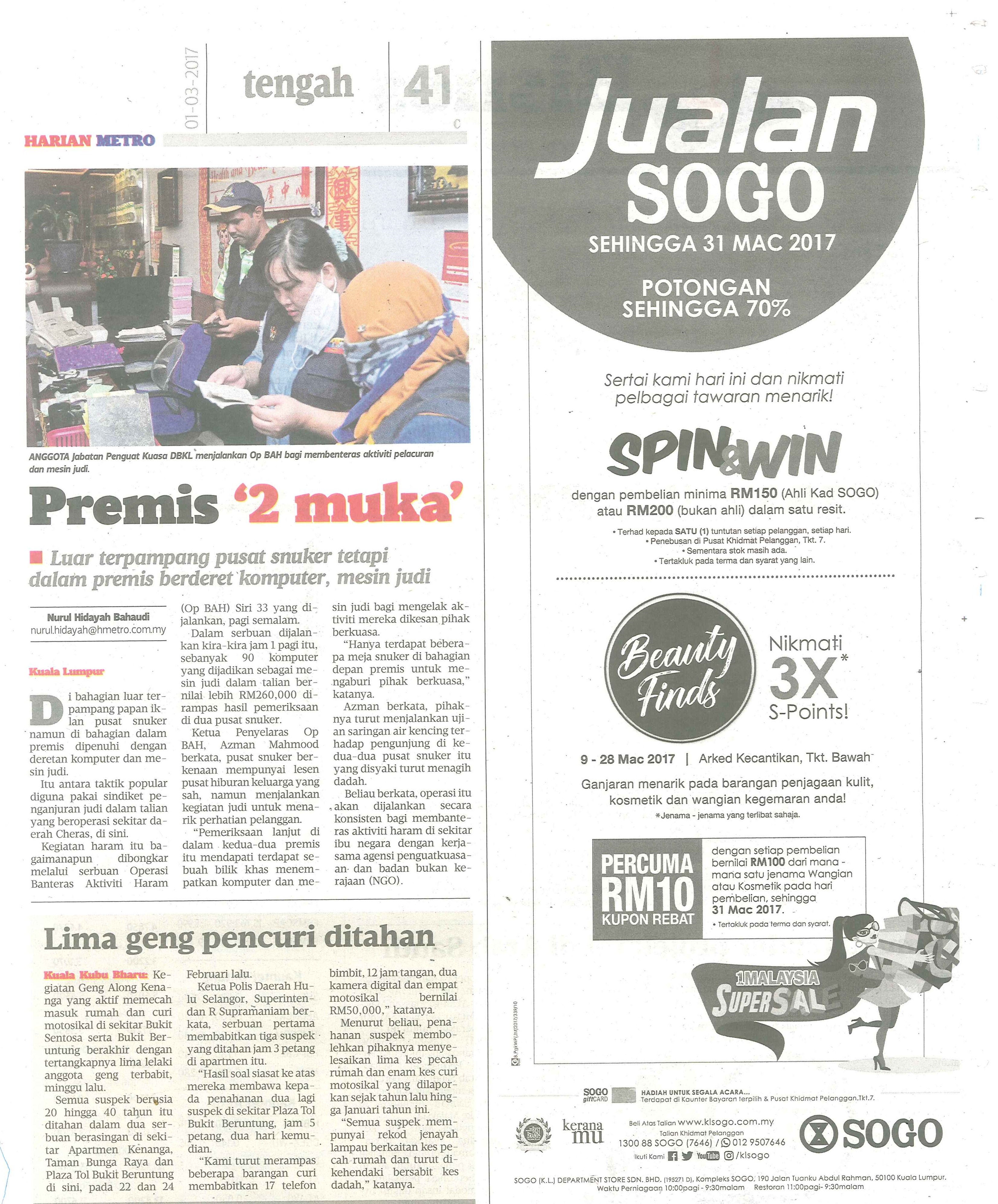 Dalam serbuan dijalankan kira-kira jam 1 pagi itu, sebanyak 90 komputer yang dijadikan sebagai mesin judi dalam talian bernilai lebih RM260,000 dirampas hasil pemeriksaan di dua pusat snuker.