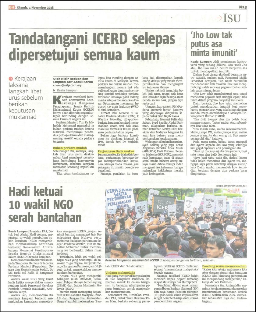 Jumaat lalu, Menteri di Jabatan Perdana Menteri, Senator P Waytha Moorthy mengesahkan Kerajaan Persekutuan komited untuk mengesahkan enam triti hak asasi manusia termasuk melaksanakan ICERD pada suku pertama tahun depan.