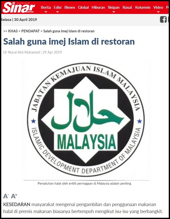 SALAH GUNA IMEJ ISLAM DI RESTORAN – SINAR HARIAN – 30/4/19