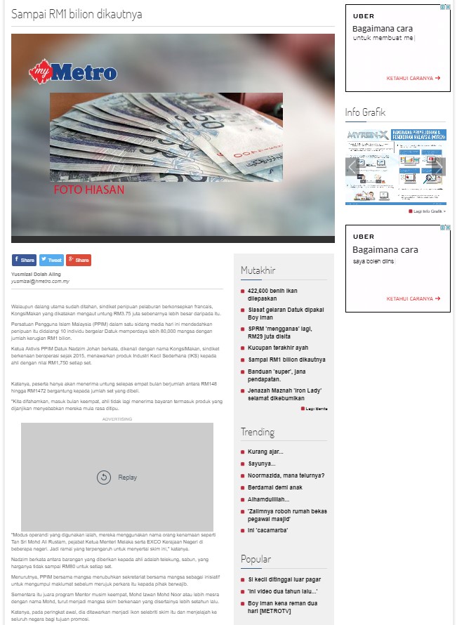 Persatuan Pengguna Islam Malaysia (PPIM) dalam satu sidang media hari ini mendedahkan penipuan itu didalangi 10 individu bergelar Datuk memperdaya lebih 80,000 mangsa dengan jumlah kerugian RM1 bilion.