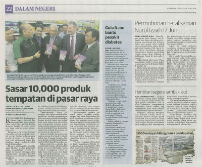 HAMZAH ZAINUDDIN (empat dari kiri) mendengar penerangan daripada Ketua Aktivis Persatuan Pengguna Islam Malaysia, Datuk Nadzim Johan (dua dari kiri) mengenai Gula Nano untuk pesakit diabetes bagi menggantikan gula pasir semasa perasmian Pasar Raya Besar Giant di Sentul, Kuala Lumpur, semalam.