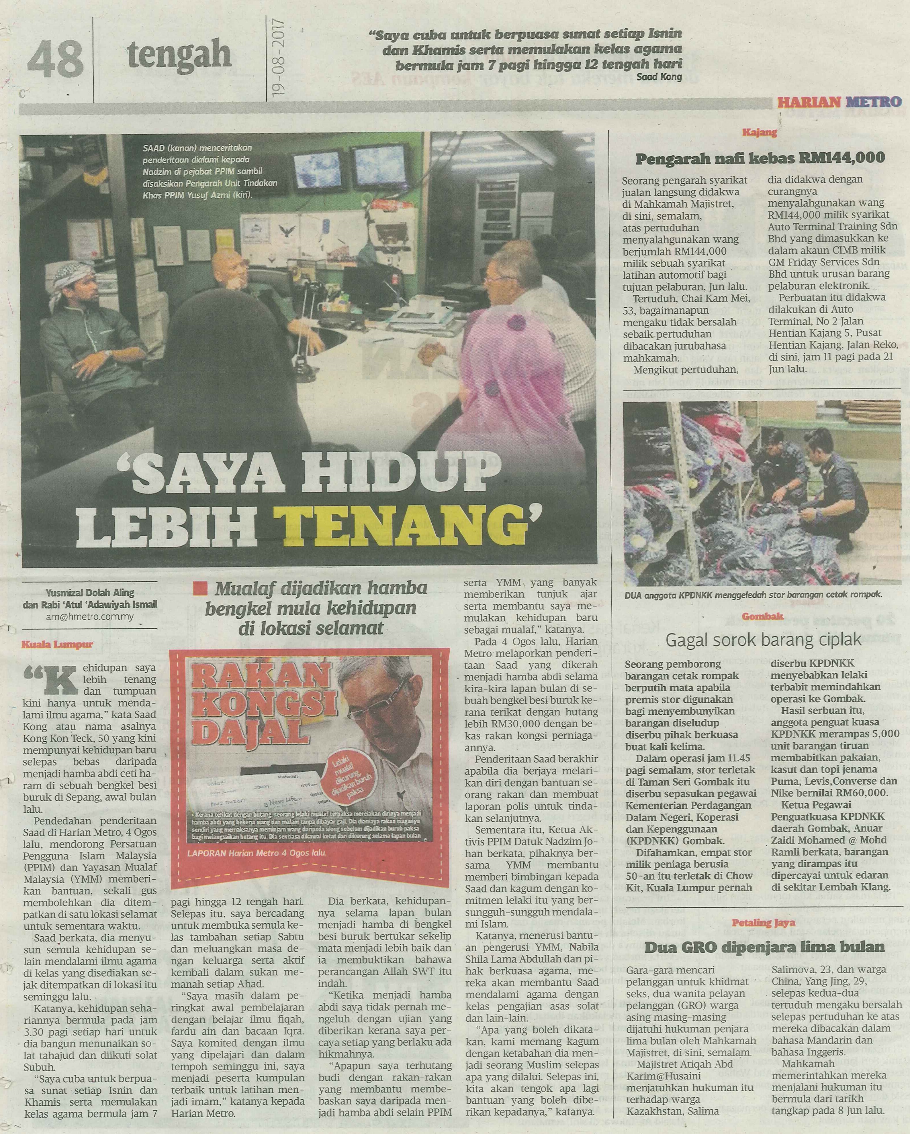Kuala Lumpur: “Kehidupan saya lebih tenang dan tumpuan kini hanya untuk mendalami ilmu agama,” kata Saad Kong atau nama asalnya Kong Kon Teck, 50 yang kini mempunyai kehidupan baru selepas bebas daripada menjadi hamba abdi ceti haram di sebuah bengkel besi buruk di Sepang, awal bulan lalu.