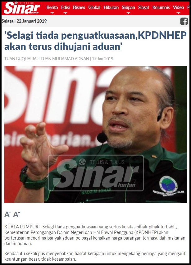 “Sekiranya denda rendah dikenakan, ia tidak akan membuka mata masyarakat terutamanya peniaga mengenai kesalahan yang dilakukan,” katanya kepada Sinar Harian. Semalam, Menteri KPDNHEP Datuk Seri Saifuddin Nasution Ismail mendedahkan, kenaikan harga makanan dan minuman mendominasi purata 4,000 aduan yang diterima pihaknya, secara puratanya setiap bulan. Lebih 50 peratus aduan yang diterima ialah mengenai kenaikan harga makanan dan minuman di premis makanan, ‘food court’ dan restoran.