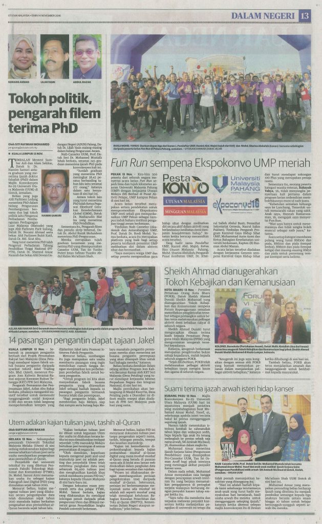 SHEIKH AHMAD DIANUGERAHKAN TOKOH KEBAJIKAN DAN KEMANUSIAAN – UTUSAN MALAYSIA – 14/11/2016
