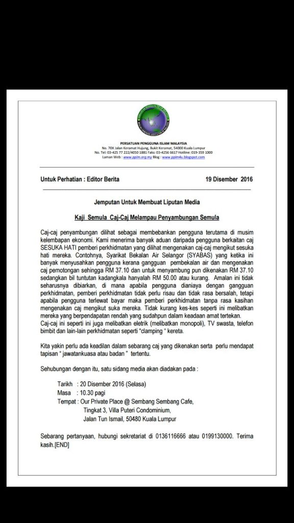 SIDANG MEDIA : “KAJI SEMULA CAJ-CAJ MELAMPAU PENYAMBUNGAN SEMULA” – 20/12/2016