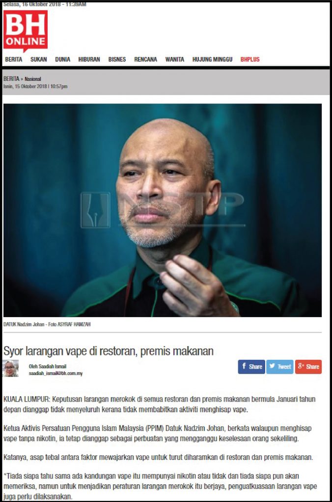 Ketua Aktivis Persatuan Pengguna Islam Malaysia (PPIM) Datuk Nadzim Johan, berkata walaupun menghisap vape tanpa nikotin, ia tetap dianggap sebagai perbuatan yang mengganggu keselesaan orang sekeliling.