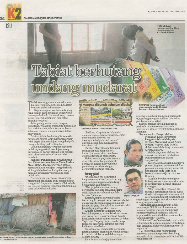 Sementara itu, Pengarah Unit Tindakan Khas Persatuan Pengguna Islam Malaysia (PPIM), Muhamad Yusuf Azmi berkata, jenayah yang berlaku akibat masalah hutang bukan suatu perkara baharu.