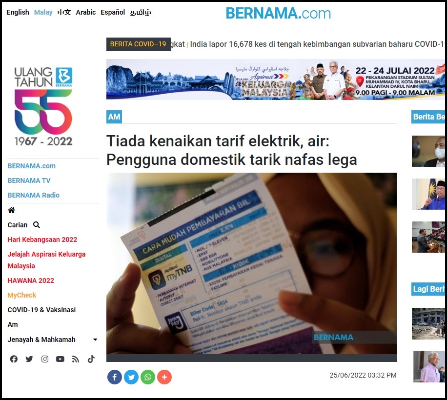 Semalam, Ismail Sabri mengumumkan kerajaan memutuskan untuk tidak menaikkan kadar tarif elektrik dan air di Semenanjung dengan terus komited menampung subsidi sebanyak RM5.8 bilion, meskipun berlaku peningkatan mendadak kos bahan api dan kos penjanaan lain.