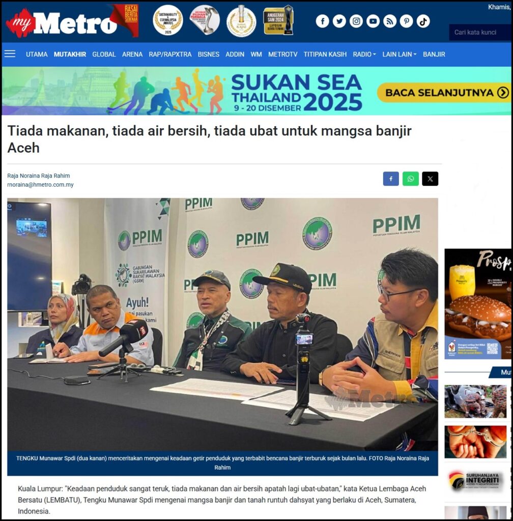 Kuala Lumpur: “Keadaan penduduk sangat teruk, tiada makanan dan air bersih apatah lagi ubat-ubatan,” kata Ketua Lembaga Aceh Bersatu (LEMBATU), Tengku Munawar Spdi mengenai mangsa banjir dan tanah runtuh dahsyat yang berlaku di Aceh, Sumatera, Indonesia.