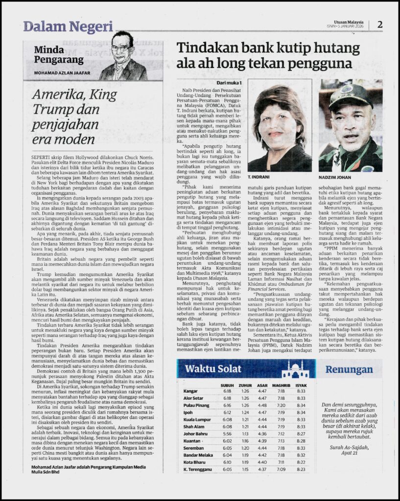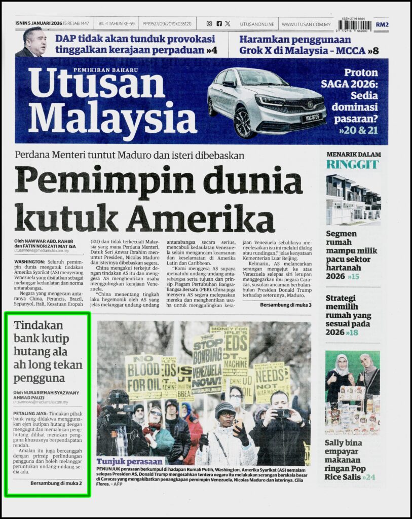 TINDAKAN BANK KUTIP HUTANG ALA AHLONG TEKAN PENGGUNA – UTUSAN MALAYSIA – 05/01/2026