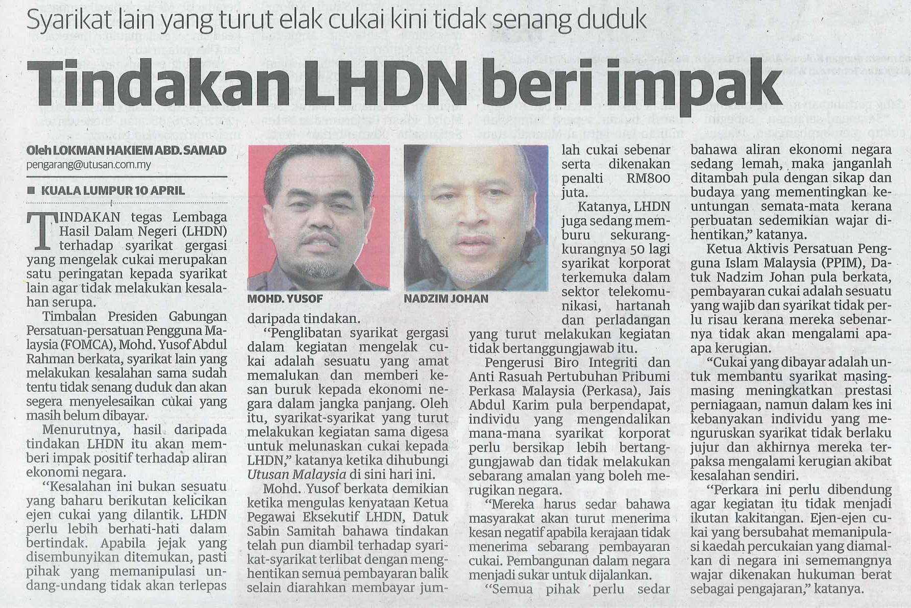 ‘‘Penglibatan syarikat gergasi dalam kegiatan mengelak cukai adalah sesuatu yang amat memalukan dan memberi kesan buruk kepada ekonomi negara dalam jangka panjang. Oleh itu, syarikat-syarikat yang turut melakukan kegiatan sama digesa untuk melunaskan cukai kepada LHDN,” katanya ketika dihubungi Utusan Malaysia di sini hari ini.
