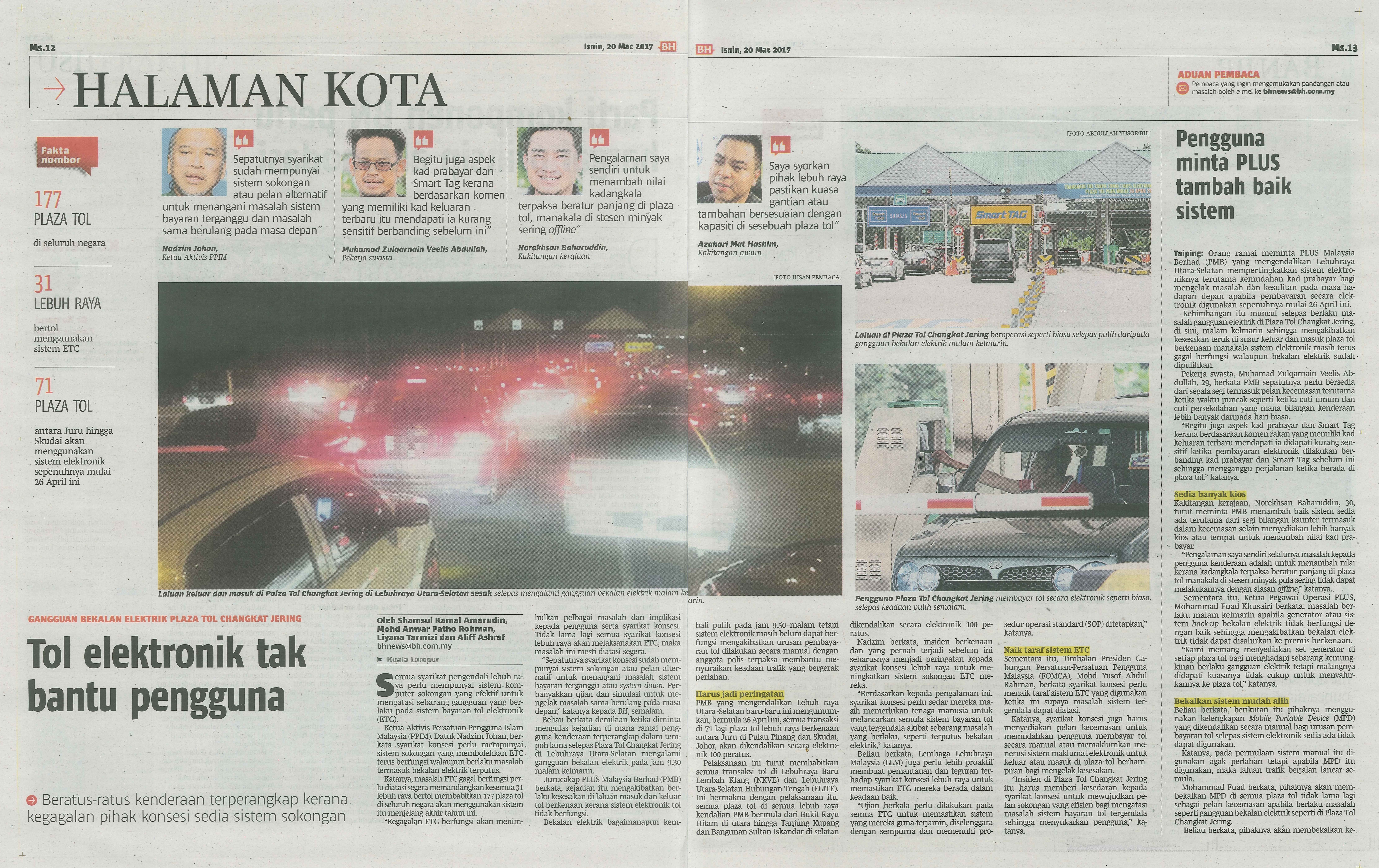 Ketua Aktivis Persatuan Penggguna Islam Malaysia (PPIM), Datuk Nadzim Johan berkata syarikat konsesi perlu mempunyai sistem sokongan yang membolehkan ETC terus berfungsi walaupun berlaku masalah termasuk bekalan elektrik terputus.