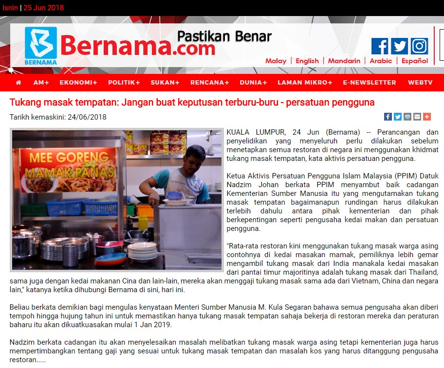 Ketua Aktivis Persatuan Pengguna Islam Malaysia (PPIM) Datuk Nadzim Johan berkata PPIM menyambut baik cadangan Kementerian Sumber Manusia itu yang mengutamakan tukang masak tempatan bagaimanapun rundingan harus dilakukan terlebih dahulu antara pihak kementerian dan pihak berkepentingan seperti pengusaha kedai makan dan persatuan pengguna.