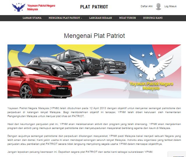 “Individu atau organisasi yang terlibat dalam penjualan atau pembelian plat PATRIOT, secara tidak langsung menyokong segala usaha YPNM dalam mencapai objektifnya,” kata kenyataan YPNM yang dipetik dari sidang media, hari ini.