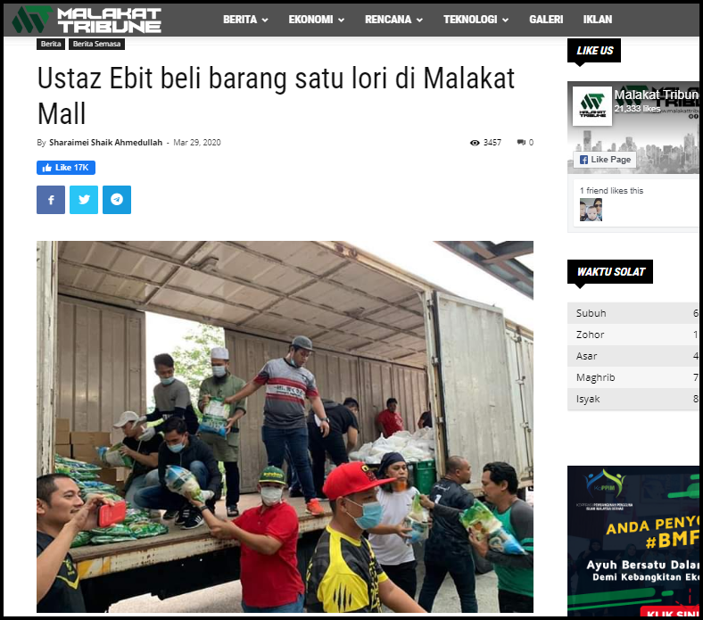 Menerusi hantaran terbaharu dalam laman Facebook miliknya, ustaz Ebit bersama beberapa anak muda yang membantunya telah memborong barangan keperluan harian tersebut dengan lori 10 tan.