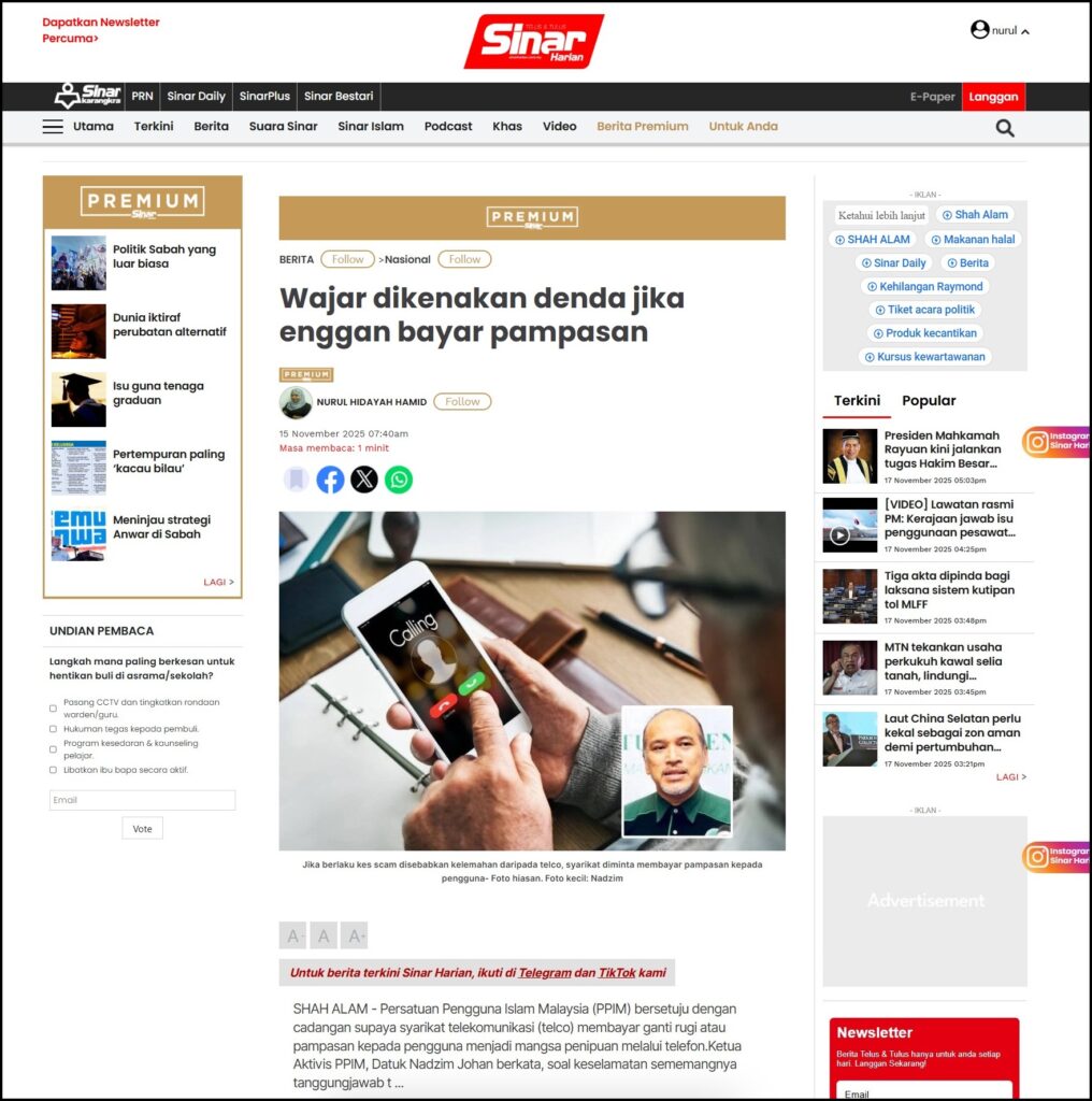 SHAH ALAM – Persatuan Pengguna Islam Malaysia (PPIM) bersetuju dengan cadangan supaya syarikat telekomunikasi (telco) membayar ganti rugi atau pampasan kepada pengguna menjadi mangsa penipuan melalui telefon.