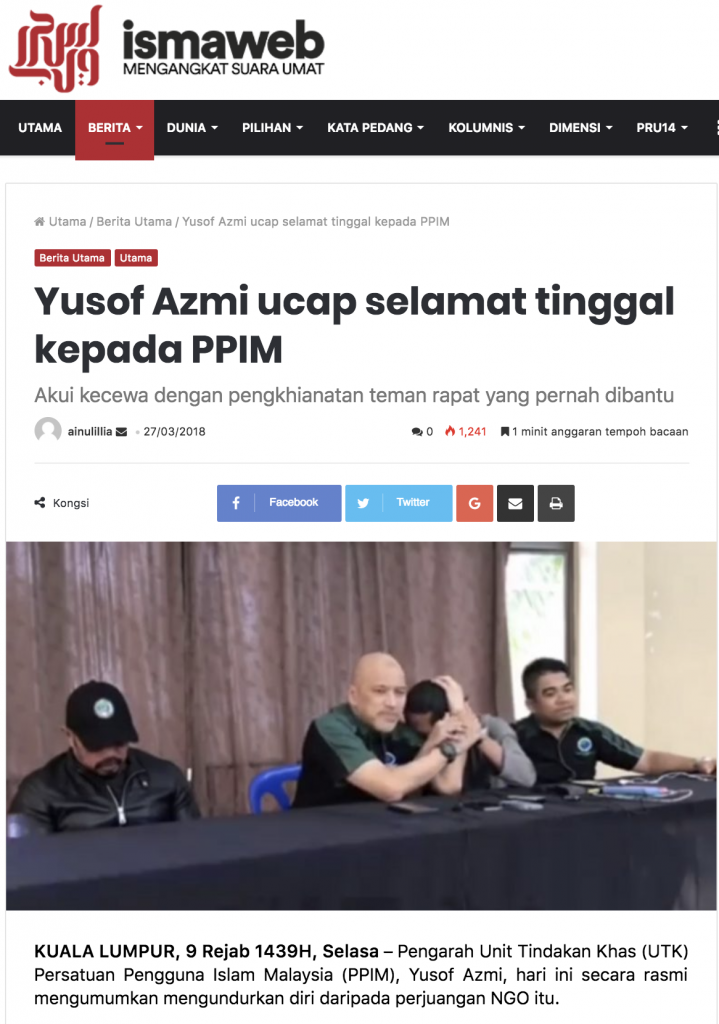 KUALA LUMPUR, 9 Rejab 1439H, Selasa – Pengarah Unit Tindakan Khas (UTK) Persatuan Pengguna Islam Malaysia (PPIM), Yusof Azmi, hari ini secara rasmi mengumumkan mengundurkan diri daripada perjuangan NGO itu.