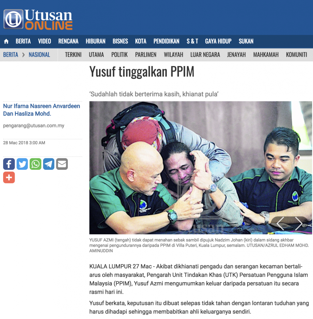 KUALA LUMPUR 27 Mac – Akibat dikhianati pengadu dan serangan kecaman bertali-arus oleh masyarakat, Pengarah Unit Tindakan Khas (UTK) Persatuan Pengguna Islam Malaysia (PPIM), Yusuf Azmi mengumumkan keluar daripada persatuan itu secara rasmi hari ini.